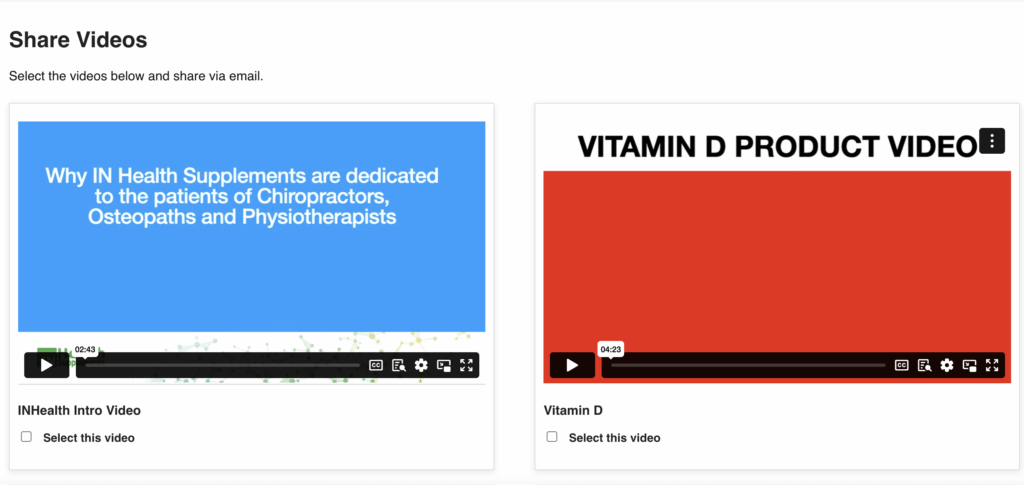 They click the link, and it takes them to a bespoke page with ONLY the videos you selected, in this case IN Health INTRO video, Chiro Ice and COLLAGEN.